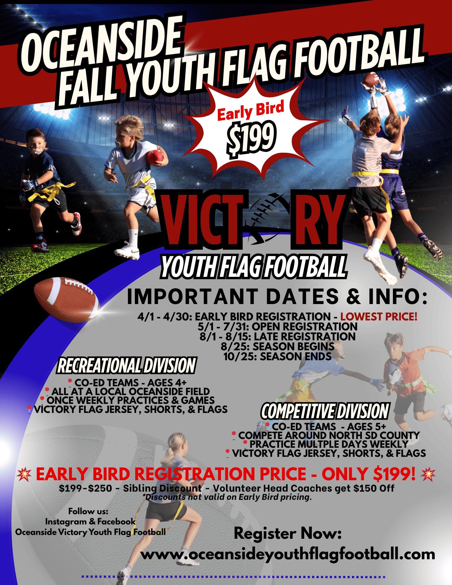 Through innovative game formats and a focus on fun, we ensure that every player not only develops athletic skills but also gains valuable life lessons in leadership, perseverance, and integrity. At Victory Youth Flag Football, we believe the game is more than just football—it’s a foundation for building confident, capable individuals who carry those values far beyond the field.